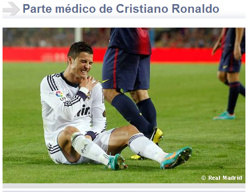 레알 마드리드는 8일(한국시각) 구단 홈페이지를 통해 '크리스티아누 호날두가 바르셀로나전에서 왼쪽 어깨를 부상했다'고 발표했다. 호날두는 바르셀로나전 후반에 시저스 킥을 시도하면서 내려오는 순간 어깨를 다친 것으로 알려졌다. 레알 마드리드 구단 측은 '부상에 관한 자세한 결과는 정밀진단을 통해 밝혀지게 될 것'이라고 설명했다.
