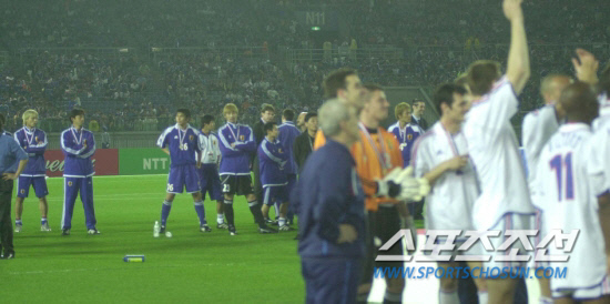 | ◇일본이 11년 전 프랑스 원정 0대5 대패 설욕에 나선다. 2001년 6월 10일 요코하마 닛산 스타디움에서 열린 2001년 FIFA컨페더레이션스컵 결승에서 프랑스에 패한 일본 선수단(왼쪽)이 프랑스 선수단의 환호를 물끄러미 바라보고 있다. 스포츠조선DB |