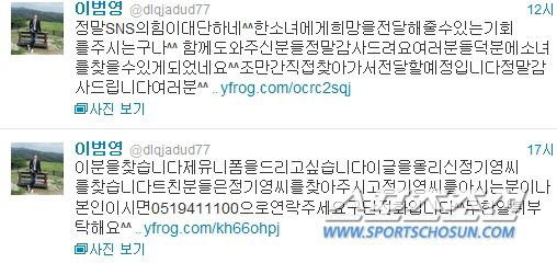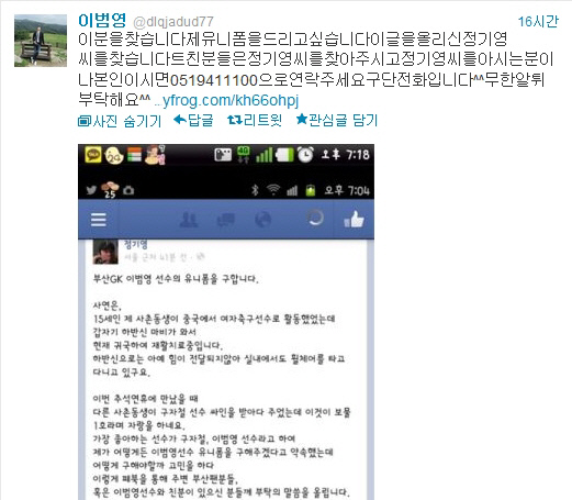 지난 6일 부산 아이파크의 '훈남 수문장' 이범영(23)은 런던올림픽에 함께 출전한 '절친' 오재석(22·강원)으로부터 문자를 받았다. 소셜네트워크서비스(SNS)에서 이범영의 도움을 기다리는 팬이 있다고 귀띔했다. 원인불명의 하반신 마비로 병상에 눕게 된 15세의 여자축구 선수였다. 이범영과 구자철의 열혈팬인 이 소녀의 사촌오빠가 절절한 글을 올렸다. '동생이 이범영 선수를 좋아해 어떻게든 선수 유니폼을 구해주겠다고 약속했는데, 어떻게 구할지 고민이다. 친분이 있는 분들께 도움을 청한다'는 내용이었다. 이범영은 오재석의 문자를 받은 후 소녀를 도울 방법을 고민했다. 구단과 논의 끝에 10일 자신의 트위터에 직접 글을 올렸다. '이분을 찾습니다. 제 유니폼을 드리고 싶습니다. 정○○씨를 아시는 분이나 본인이시면 구단 전화로 연락주세요'