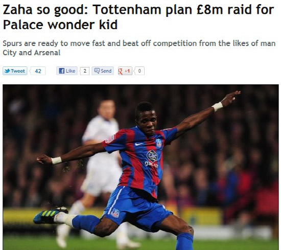 14일(한국시각) 영국 주간지 더피플은 토트넘이 1월 이적시장에서 자하 영입을 위해 800만파운드를 준비했다고 보도했다. 잉글랜드 21세 이하 대표팀원이기도 한 자하는 빠른 스피드와 개인기, 결정력을 보유한 잉글랜드 최고의 유망주로 평가받고 있다. 당연히 빅클럽의 러브콜이 이어지고 있다. 위건과 볼턴이 자하의 영입을 위해 300만파운드의 금액을 제시했지만, 잉글랜드 프리미어리그 클럽들이 두배 이상의 이적료를 제시하며 크리스탈 팰리스의 마음을 흔들고 있다.