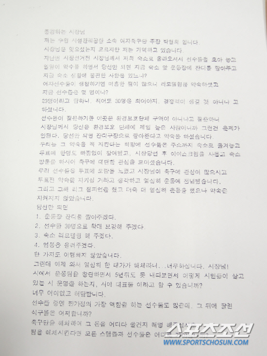스포츠조선은 수원FMC 선수단이 염 시장 측에 전달한 호소문을 단독 입수했다. 이 호소문에는 염 시장의 취임 전 행적이 고스란히 담겨 있다. 염 시장은 2010년 6월 총선 전 수원FMC 선수단을 찾아 지지를 호소했다. 한 표가 아까운 상황에서 시를 연고로 뛰는 선수단의 지지가 절실한 상황이었다. 수원FMC 주장인 박현희는 호소문에서 "당시 시장님은 선수단을 만난 자리에서 일일이 악수를 하며 당선만 되면 연습구장 인조잔디 구축 및 선수단 규모 확대, 숙소 리모델링 및 연봉 인상 등을 약속했다"고 주장했다. 그러면서 "선수들이 숙소 인근이 환경보호지정 구역이 아니냐고 질문하니 '본인이 환경보호 단체에서 제일 높은 사람이니까 그런 건 문제가 안된다. 당선만 되면 꼭 잔디구장으로 깔아준다'고 약속했다"고 덧붙였다. 박현희는 "약속을 믿고 열심히 뛴 댓가가 결국 해체라니 너무 어이가 없고 허탈하다"면서 팀 해체로 생기는 재정의 용처를 규명해 줄 것을 요구했다.