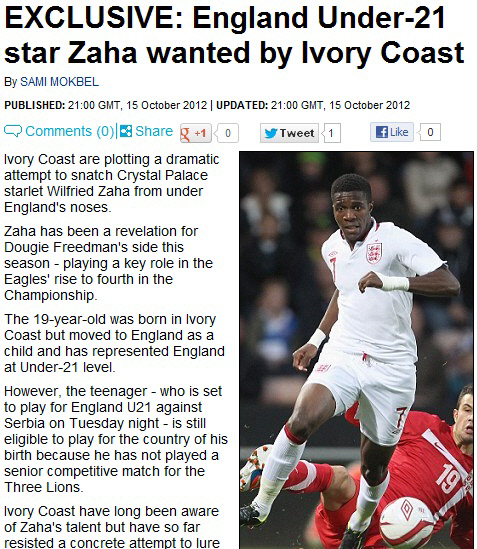자하는 현재 챔피언십(2부리그) 최고의 선수다. 그는 아스널, 맨시티, 리버풀, 뉴캐슬 등의 러브콜을 받고 있으며, 토트넘은 영입 후 다시 크리스탈 팰리스로 임대시킬 계획까지 세우는 등 적극적인 행보를 보이고 있다. 자하는 현재 어떤 국적을 선택할지를 두고 고심을 거듭하고 있다.