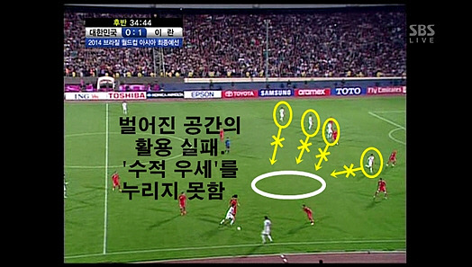 고지대에서 느낀 체력 저하의 부담도 컸을 것이다. 앞서 언급한 것처럼 최강희호 역시 종종 측면으로 볼을 보내 크로스의 효과를 보려고 했다. 하지만 이러한 패턴을 구사함에 있어 지친 동료들이 같이 싸워주지 못한 것이 문제였다. 상대 선수와 1:1로만 경합하는 건 수적인 우세를 활용하는 데 도움이 되지 않았고, 그 결과 크로스의 성공 확률도, 공격 템포도 많이 떨어졌다. 게다가 교체 투입된 손흥민과 이청용이 가끔씩 공격진-허리진 사이에서 볼을 잡고 드리블을 친다 해도, 이것이 연계 플레이로 이어지지 않았다는 점이 결국엔 최강희호의 발목을 잡았다.<홍의택 객원기자, 제대로 축구(http://blog.naver.com/russ1010)>