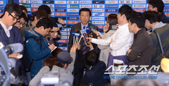 이란과의 대결에서 0대1로 패한 축구국가대표팀이 18일 오후 인천공항을 통해서 귀국했다. 최강희 감독이 이끄는 대표팀은 17일 새벽 이란 테헤란 아자디스타디움에서 열린 2014 브라질 월드컵 아시아지역 최종예선 A조 4차전에서 0대1로 패한바 있다. 최강희 감독이 입국장에서 기자회견을 갖고 있다. 인천공항=최문영 기자 deer@sportschosun.com /2012.10.18/