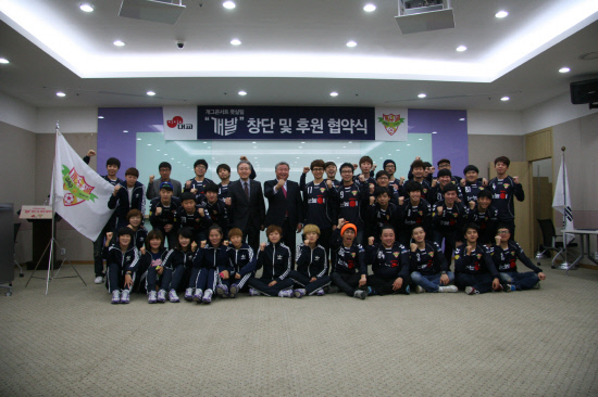 여자 프로축구단과 여자 배드민턴단을 운영하고 있는 ㈜대교는 19일 서울 여의도 한국스카우트연맹에서 개그맨 풋살팀 '개발'과 후원 협정서 체결식을 가졌다.