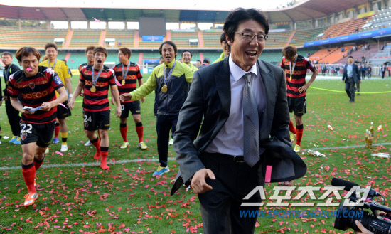 2012 하나은행 FA컵 결승 포항 스틸러스와 경남 FC의 경기가 20일 포항스틸야드에서 열렸다. 1대0으로 승리하며 우승을 차지한 포항 황선홍 감독이 선수들과 함께 서포터즈에게 달려가고 있다. 포항=허상욱 기자 wook@sportschosun.com/2012.10.20/