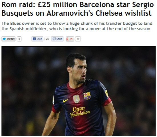 21일(한국시각) 영국 일간지 데일리미러는 로만 아브라모비치 첼시 구단주가 부스케츠 영입을 위해 2500만파운드의 이적료를 준비했다고 보도했다. 데일리미러에 따르면 부스케츠 측은 이번 시즌이 끝나고 바르셀로나를 떠날수도 있음을 시사했다고 했다. 바르셀로나에서 나고 자란 부스케츠는 호셉 과르디올라 감독 부임 후 바르셀로나의 핵심 미드필더로 떠올랐다. 그는 바르셀로나에서 행복하지만 새로운 도전을 계획하고 있는 것으로 알려졌다.