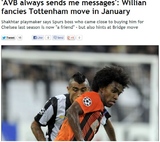 토트넘과 윌리언(샤크타르 도네츠크)의 끈은 아직 끊어지지 않았다. 토트넘은 올여름 이적시장에서 윌리언의 영입을 위해 모든 노력을 기울였지만 성사되지 않았다. 윌리언은 마지막까지 구단에 풀어줄 것을 요청했지만, 토트넘과 샤크타르는 이적료에서 합의를 이루지 못했다. 그러나 아직까지 토트넘은 윌리언 영입의 꿈을 접지 않았다.