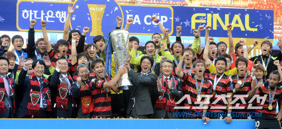 2012 하나은행 FA컵 결승 포항 스틸러스와 경남 FC의 경기가 20일 포항스틸야드에서 열렸다. 1대0으로 승리하며 우승을 차지한 포항 황선홍 감독과 선수들이 우승컵을 들고 환호하고 있다. 포항=허상욱 기자 wook@sportschosun.com/2012.10.20/
