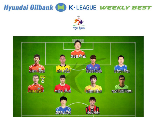 프로연맹은 지쿠와 오재석을 비롯해 제주 유나이티드전 득점으로 외국인 선수 최다골 타이 기록을 세운 데얀(서울)과 경남FC전에서 수원 데뷔골을 터뜨리며 승리를 이끈 조동건(수원), 박종우(부산) 김성환(성남) 레오나르도(전북) 코니(전남) 정인환(인천) 양상민(수원) 정성룡(수원)을 주간 베스트11에 선정했다. 위클리 베스트팀은 성남 일화로 선정됐고, 수원-경남전이 베스트 매치의 영예를 안았다. 박상경 기자 ppark@sportschosun.com