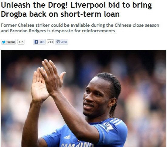 28일(한국시각) 영국 주간지 더피플은 브렌단 로저스 감독이 루이스 수아레스 혼자 분투하고 있는 공격진을 보강하기 위해 드로그바의 상황을 주시하고 있다고 보도했다. 실현 가능성이 없는 얘기가 아니다. 드로그바가 소속된 중국리그는 다음주 일정이 끝이 난다. 미국 메이저리그사커에사 뛰던 데이비드 베컴이 그랬던 것처럼 중국의 새시즌이 시작될때까지 드로그바가 잉글랜드 프리미어리그에서 임대로 뛰는데 문제가 없다. 드로그바의 가족은 여전히 영국의 서리 지역에 머물고 있는데다, 드로그바는 1월부터 2월 남아공에서 열릴 아프리칸 네이션스컵을 위해 몸상태를 유지하고 싶어한다. 지금부토 1월까지만 리버풀의 최전방을 책임진다면, 그 뒤에는 파비우 보리니가 부상에서 복귀한다. 여러모로 시나리오가 딱딱 맞아떨어진다.