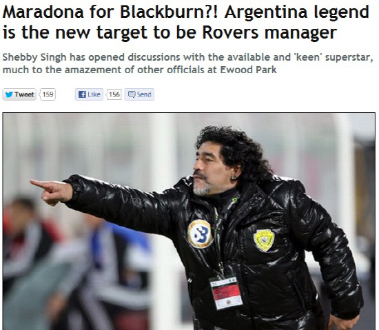 그러나 감독으로 이렇다할 성과가 없다는 점과 영어에 능통하지 않다는 점, 그리고 언론과 관계가 그리 좋지 않다는 점은 마라도나의 약점으로 꼽힌다. 현재 블랙번의 기술이사 데릭 쇼는 마라도나 대신 경험 많은 감독을 원하고 있어, 마라도나의 블랙번 감독 입성은 조금 더 지켜봐야 할 듯 하다.