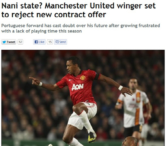 30일(한국시각) 영국 일간지 데일리미러는 나니가 맨유의 재계약 제안을 거절할 것이라고 보도했다. 나니는 올시즌 맨유가 치른 13경기에서 단 5경기만을 선발로 나섰다. 그는 지난 브라가와의 유럽챔피언스리그와의 경기 후 '나의 미래는 신만이 알고 있다'며 맨유 잔류 여부에 대해 답했다. 이어 "나는 완벽한 컨디션이다. 육체적으로도 좋은 상태다. 나는 항상 알던 나니와 같다"며 알렉스 퍼거슨 감독을 우회적으로 비판했다.