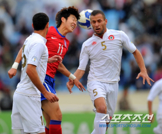 레바논과의 브라질월드컵 아시아지역 3차예선에서 공중볼을 다투고 있는 손홍민.베이루트(레바논)=허상욱 기자