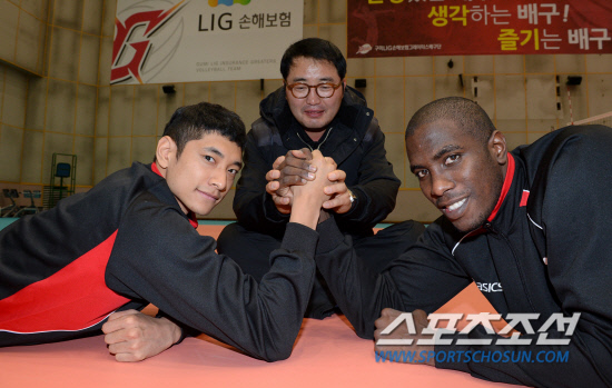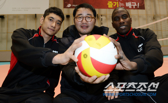 프로배구 LIG손해보험의 이경석 감독과 김요한, 새 외국인 선수 카메호가 25일 경기 수원 LIG 인재니움에서 포즈를 취하고 있다. 수원=허상욱 기자 wook@sportschosun.com/2012.10.25/