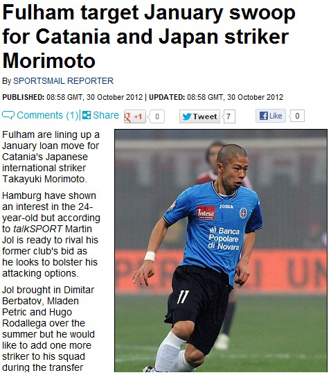 욜 감독은 올시즌 디미타르 베르바토프, 믈라덴 페트리치, 유고 로다에가로 풀럼 공격진을 개편했다. 그러나 선수들의 부상이 이어지며 추가적인 공격수 보강이 절실한 상황이다. 풀럼측 역시 1월이적시장에서 공격수 보강을 약속했다. 2006년 세리에A에 합류한 모리모토가 풀럼 레이더에 걸렸다. 모리모토는 올시즌 완전히 주전자리에서 밀렸다. 카타니아는 임대로 모리모토를 보내는 것에 대해 적극적인 반응을 보이고 있다고 데일리메일은 전했다.