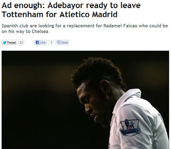 아틀레티코 마드리드는 대체자를 찾기 시작했다. 아데바요르가 레이더망에 걸렸다. 아데바요르는 올시즌 토트넘으로 완전이적에 성공했지만, 안드레 비야스 보아스 감독과 불화설이 이어지며 좀처럼 경기에 나서지 못하고 있다. 비야스 보아스 감독은 저메인 데포의 최전방 기용을 선호하고 있다. 아데바요르는 과거 레알 마드리드에서 활약하며 스페인 무대에 대한 적응을 한 바 있다. 토트넘은 아데바요르의 공백이 메워지지 않는 한 그의 이적을 허락하지 않는다는 입장이다. 더피플에 따르면 현재 토트넘은 만약을 대비해 세비야의 알바로 네그레도를 살펴보고 있는 것으로 알려졌다.