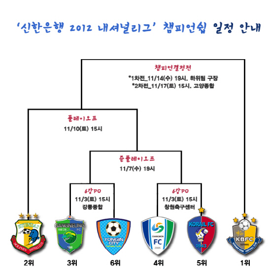 인천코레일은 7일 오후 7시 인천문학구장에서 용인시청과의 2012년 신한은행 내셔널리그 준플레이오프(PO)를 갖는다. 정규리그 5위 인천코레일은 6강PO에서 창원시청을 2대0으로 제압하고 준PO에 진출했다. 7골-3도움을 기록한 골잡이 김태욱의 득점력과 플레이메이커 안정구의 게임리딩에 기대를 건다. 정규리그를 6위로 마치며 용인시청은 창단 3년만에 처음으로 챔피언십에 진출해 준PO까지 올랐다. 지난 강릉시청과의 6강PO에서 승부차기까지 가는 접전 끝에 승리를 거뒀다. 고경민(12골 6도움)-김연건(6골 2도움) 공격 듀오의 협력플레이가 물이 올랐지만 6강PO 입은 체력 부담을 얼마나 해소하느냐가 승부의 관건이 될 전망이다. 올 시즌 두 차례 맞대결에서는 용인시청이 모두 이겼다.