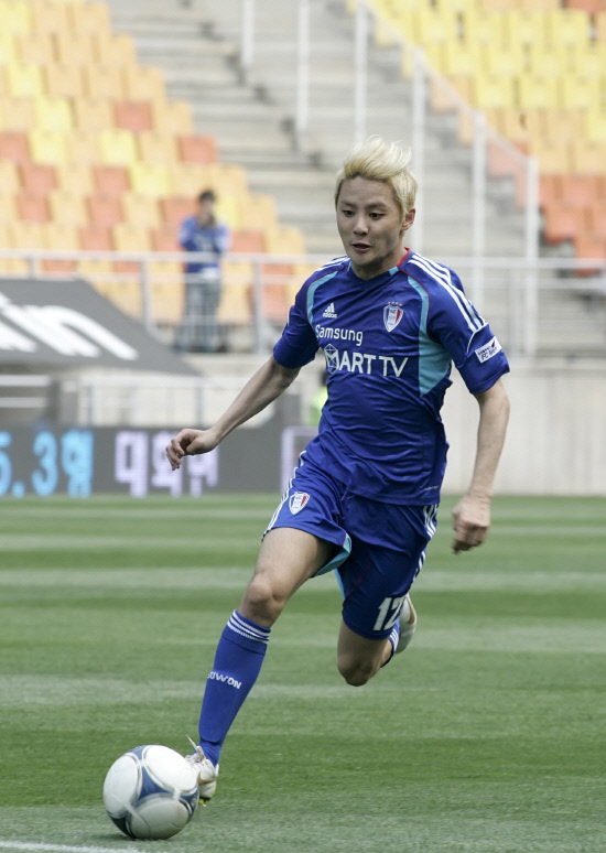 ◇김준수는 뮤지컬 배우로 활동하면서 틈틈이 수원 산하 연예인 축구팀 FCMEN의 단장 역할도 수행하고 있다. 지난 5월 19일 수원월드컵경기장에서 열린 FCMEN-매탄중 간의 경기에서 김준수가 드리블을 하고 있다. 당시 김준수는 엘리자벳의 '죽음' 토드 역을 열연하기 위해 머리를 탈색한 상황에서 바쁜 시간을 쪼개 FCMEN 활동을 했다. 사진제공=수원 삼성