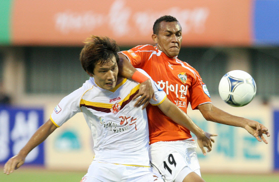 | ◇지난 7월 29일 강릉종합운동장에서 열린 강원-광주 간의 2012년 K-리그 24라운드에서 광주 정우인(왼쪽)과 강원 웨슬리가 볼을 다투고 있다. 사진제공=강원FC |