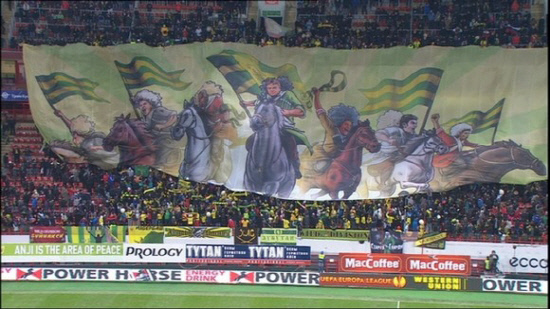 경기 시작 직전 스타디움 중앙 부근에서 대형 응원 걸개그림이 펼쳐져 장관을 이뤘다. 가로 폭이 20m 가까이 되는 대형 캔버스에는 거스 히딩크 감독과 선수 6명을 실크로드를 누비는 기마병으로 묘사하고 있다.