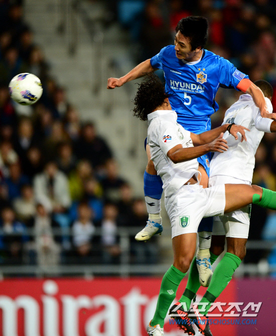 '철퇴축구' 울산현대가 10일 울산월드컵경기장에서 알아흘리(사우디아라비아)와 2012아시아챔피언스리그 결승전 단판 승부를 펼쳤다. 전반 13분 곽태휘가 헤딩 선제골을 성공시키고 있다. 울산=송정헌 기자 songs@sportschosun.com