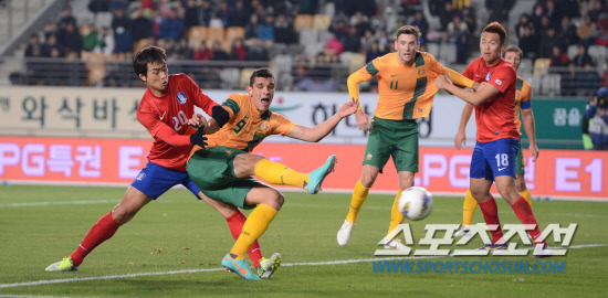 14일 오후 경기도 화성종합경기타운에서 한국과 호주 축구국가대표팀의 평가전이 열렸다. 후반 한국 이동국이 호주 엘리의 슈팅을 막으려 하고 있다. 화성= 김경민 기자 kyungmin@sportschosun.com / 2012.11.14.