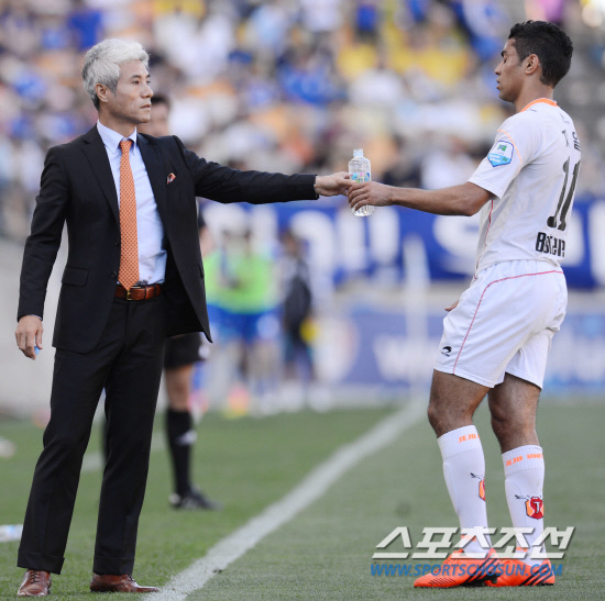 제주 박경훈 감독이 경기중 자일에게 물병을 건네고 있다. 수원=최문영 기자 deer@sportschosun.com /2012.09.23/