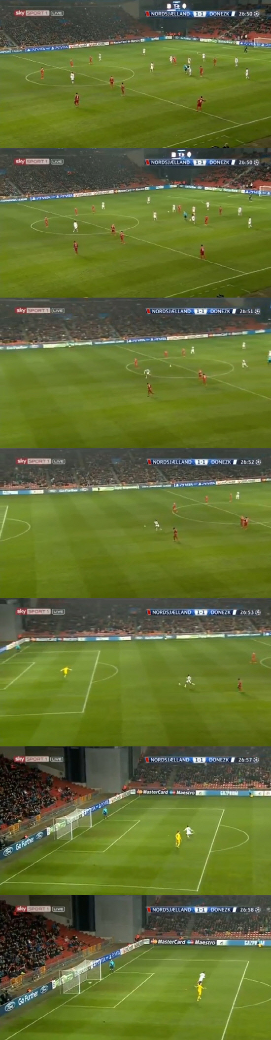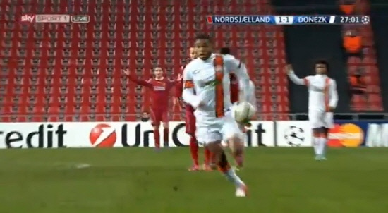 루이스 아드리아누가 비매너골 플레이를 하고 있다. 노르셀란드 선수들 뿐만 아니라 샤흐타르 선수들도 손을 들고 어이없어 한다. 사진캡쳐=스카이스포츠