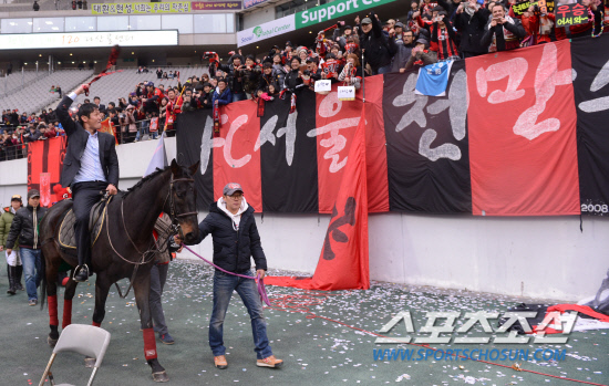2012 K리그 우승을 확정지은 FC서울 최용수감독과 선수들이 25일 전북과의 홈경기에서도 1대0으로 승리한 후 우승의 기쁨을 만끽하고 있다. 최용수 감독이 말을 타고 등장해 서포터스들과 환호하고 있다. 상암=최문영 기자 deer@sportschosun.com /2012.11.25/