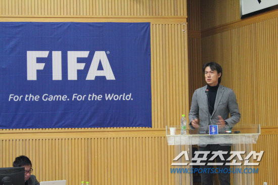 홍명보 전 올림픽대표팀 감독이 26일 파주 트레이닝센터에서 열린 제1차 P급 지도자 세미나에서 '런던올림픽 성공 이야기'에 대한 특강을 펼치고 있다. 파주=김진회 기자