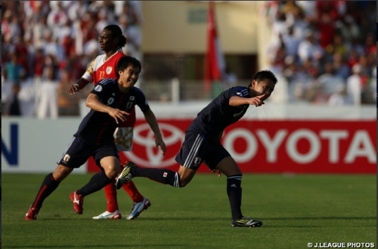 | ◇14일(한국시각) 오만 무스카트에서 열린 오만-일본 간의 2014년 브라질월드컵 아시아지역 최종예선 B조 5차전에서 전반 20분 일본 공격수 기요타케 히로시(오른쪽)가 선제골을 넣은 뒤 환호하고 있다. 사진출처=일본축구협회 공식 홈페이지 |