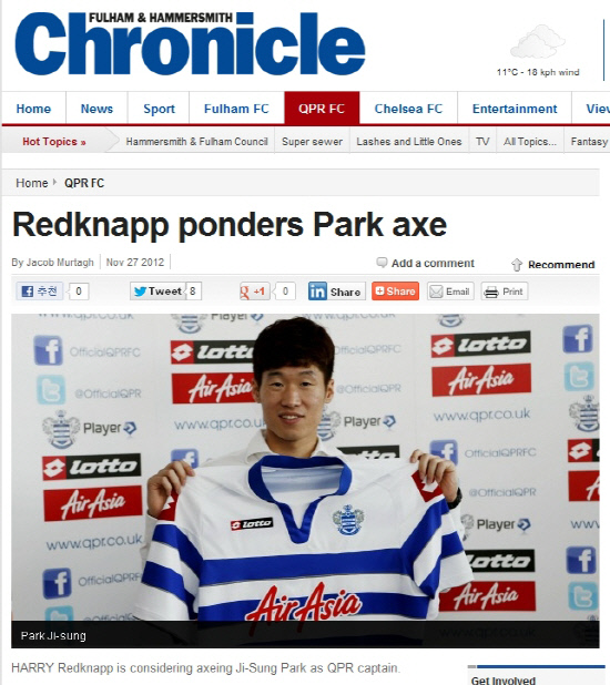 박지성은 7년간 정든 맨유를 떠난 QPR에 새 둥지를 틀면서 생애 첫 주장을 찼다. 토니 페르난데스 QPR 구단주의 영향과 마크 휴즈 감독의 결정으로 탄생한 '캡틴 박'이었다. 그러나 실망이 커져갔다. 그라운드 안팎에서 거센 비난에 휩싸였다. 팀 내 불화설을 잠재우지 못했다. 고액 연봉 선수들과 기존 선수들간의 불화가 터졌다. 고액 연봉 선수에는 박지성도 포함된다. 무엇보다 시즌 첫 승을 따내지 못한 것이 마치 박지성의 모든 책임인냥 비춰지고 있다. 박지성도 스트레스를 받지 않을 수 없다.