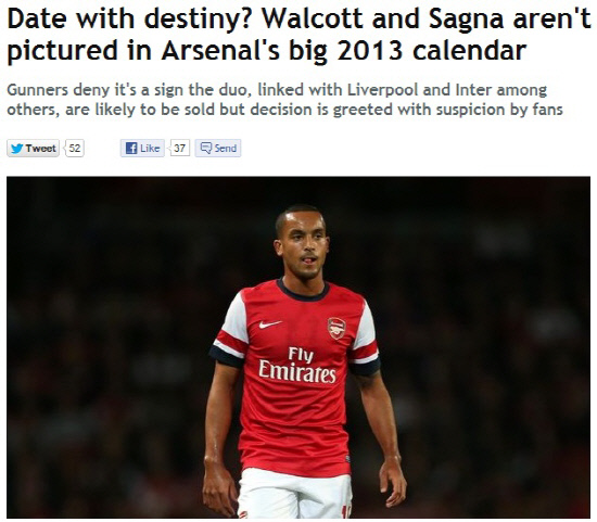 '재계약 협상'에서 난항을 보이고 있는 시오 월컷과 바카리 사냐가 아스널의 2013년용 달력에서 제외됐다. 아르센 벵거 아스널 감독은 이번 모델 제외가 이들을 팔기 위한 의도가 아니라고 했지만, 팬들의 의혹은 사그러들지 않고 있다.