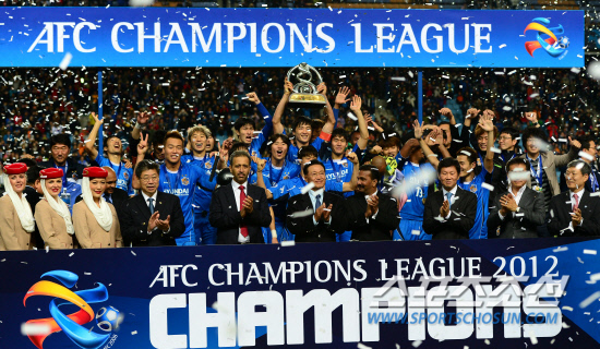 '철퇴축구' 울산현대가 아시아 정상에 올랐다. 울산현대는 10일 울산월드컵경기장에서 알아흘리(사우디아라비아)와 2012아시아챔피언스리그 결승전에서 3대0 대승을 거두며 우승을 차지했다. 경기 종료 후 우승트로피를 들어보이며 우승의 기쁨을 나누고 있는 선수들. 울산=송정헌 기자 songs@sportschosun.com