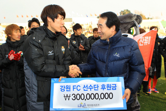 최흥집 하이원리조트 대표이사가 K-리그 잔류에 성공한 강원FC에 포상금을 지급했다.