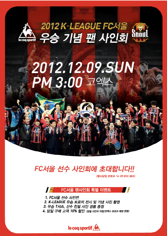 FC서울이 9일 오후 3시 유니폼 스폰서인 르꼬끄와 함께 'FC서울 K-리그 우승 기념 팬 사인회'를 개최한다.