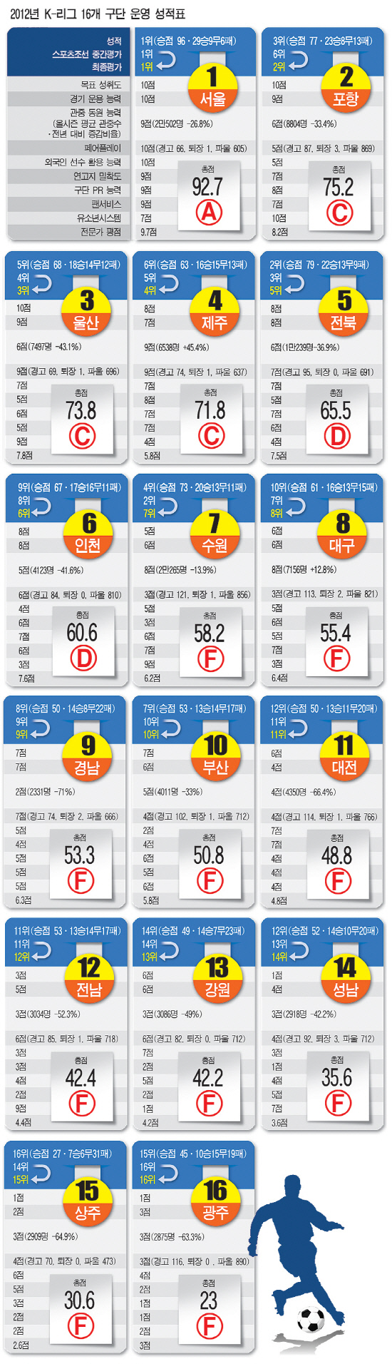 1위는 2012년 K-리그 챔피언 서울이었다. 성적은 물론 행정, 흥행, 전문가 평가에서도 경쟁 상대는 없었다. 92.7점으로 A학점을 받았다. 라이벌 수원은 중간평가에서 2위를 차지했지만, 최종 평가에서 7위로 떨어졌다. 총점 58.2점으로 F학점이었다. FA컵 우승, 정규리그에서 3위를 차지한 포항과 아시아 정상을 밟은 울산이 2위(75.2점), 3위(73.8점)로 약진했다. 하지만 서울과의 점수 차는 컸다. 최하위는 이견이 없었다. 시즌내내 잡음이 끊이지 않은 광주였다. 2부 리그로 떨어진 광주는 10개 항목에서 모두 5점 이하의 점수를 받아 총점은 23점에 불과했다. 계속해서 구단을 운영하려면 개혁이 아니 혁명이 요구된다.