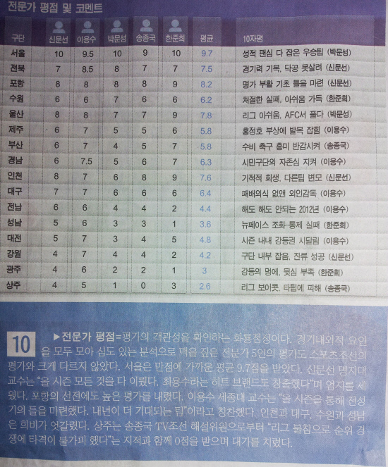 평가의 객관성을 확인하는 화룡점정이다. 경기내외적 요인을 모두 모아 심도 있는 분석으로 맥을 짚은 전문가 5인의 평가도 스포츠조선의 평가와 크게 다르지 않았다. 서울은 만점에 가까운 평균 9.7점을 받았다. 신문선 명지대 교수는 "올 시즌 모든 것을 다 이뤘다. 최용수라는 히트 브랜드도 창출했다"며 엄지를 세웠다. 포항의 선전에도 높은 평가를 내렸다. 이용수 세종대 교수는 "올 시즌을 통해 전성기의 틀을 마련했다. 내년이 더 기대되는 팀"이라고 칭찬했다. 인천과 대구, 수원과 성남은 희비가 엇갈렸다. 상주는 송종국 TV조선 해설위원으로부터 "리그 불참으로 순위 경쟁에 타격이 불가피 했다"는 지적과 함께 0점을 받으며 대가를 치렀다.