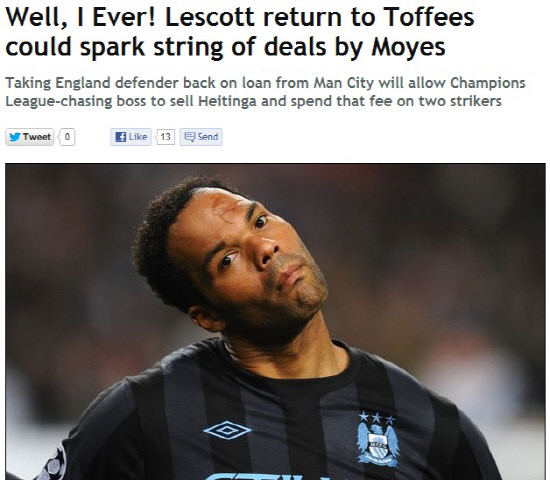 13일(한국시각) 영국 일간지 데일리미러는 에버턴이 수비보강을 위해 1월이적시장에서 레스컷 영입을 계획하고 있다고 보도했다. 데이비드 모예스 에버턴 감독은 레스컷을 다시 데려오고 싶다는 뜻을 여러차례 밝힌 바 있다. 상황이 나쁘지 않다. 로베르토 만시니 맨시티 감독은 더이상 레스컷에 기대를 걸지 않는 눈치다. 지난 맨체스터 더비에서 뱅상 콤파니가 부상했을때도 레스컷 대신 콜로 투레를 투입한 바 있다. 여기에 맨시티는 1월이적시장에서 수비를 강화하기 위해 파리생제르맹의 마마두 사코, 리버풀의 다니엘 아게르, 뉴캐슬의 파브리치오 콜로치니 중 한명을 영입할 계획을 세웠다.