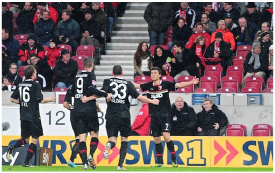 | 구자철(오른쪽)이 29일 슈투트가르트전에서 골을 넣은 후 동료들과 기쁨을 나누고 있다&21745; 사진캡처=아우크스부르크 홈페이지 |