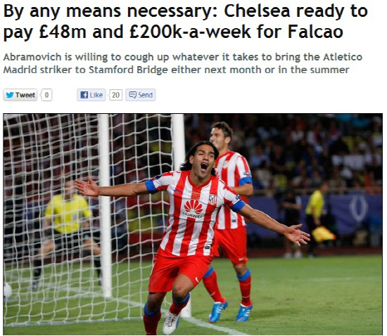 한편, 데일리미러는 첼시가 팔카오를 영입하면 '5000만파운드의 사나이' 페르난도 토레스를 방출할 계획이었지만, 최근 부활의 몸짓을 펼치며 팔카오와 투톱으로 기용할 가능성도 있다고 전했다.