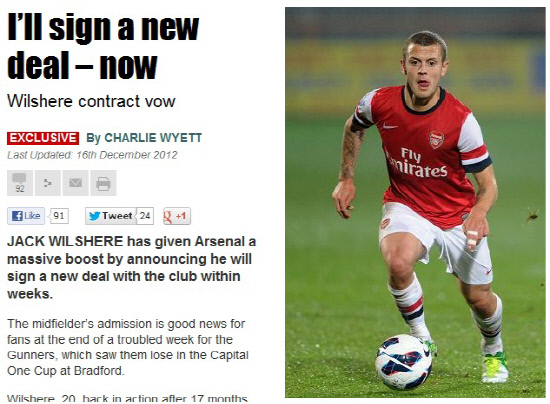 윌셔는 17일(한국시각) 영국 일간지 더선을 통해 "나는 2주안에 내 미래를 정리할 것이다"며 "다른 톱 선수들은 아스널에 밝은 미래가 없다고 하지만 내 생각은 다르다"며 재계약 의사를 전했다. 윌셔는 현재 주급 5만파운드에 계약기간이 2년반 남아있지만, 재계약을 통해 2017년까지 아스널에서 뛸 예정이다. 윌셔는 17개월간의 긴 재활 끝에 그라운드에 복귀해 좋은 모습을 보이고 있다. 창의성과 개인기를 모두 갖춘 윌셔는 아스널 뿐만 아니라 잉글랜드의 희망으로 불리고 있다. 윌셔의 재계약 소식은 캐피탈원컵에서 주축선수를 내보내고도 패하며 실망감을 얻은 아스널팬들에게는 모처럼 들린 희소식이다.