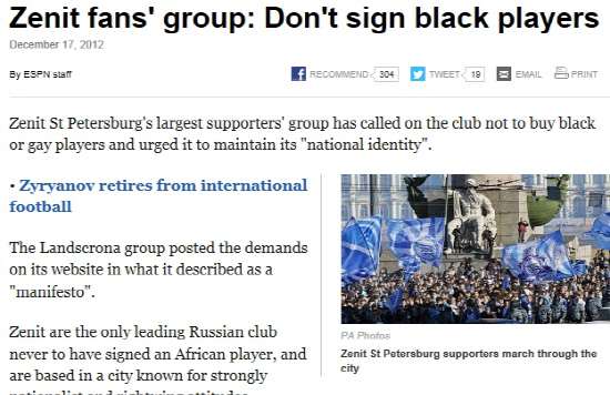 현지 언론은 몇몇 흑인 스타 플레이어들이 제니트의 좋은 조건을 거절했다고 보도했다. 이유는 팬들의 위협때문이라고 했다.