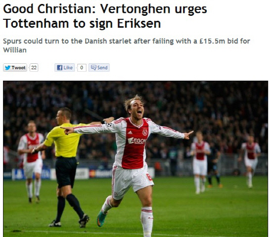 얀 베르통헨이 토트넘에 크리스티앙 에릭센을 영입하라고 촉구하고 나섰다. 베르통헨은 올시즌 토트넘으로 이적하기 전까지 아약스에서 에릭센과 한솥밥을 먹었다. 베르통헨은 18일(한국시각) 영국 일간지 데일리미러와의 인터뷰에서 "기술적으로 에릭센은 내가 본 최고의 선수 중 하나다. 나는 에릭센이 토트넘에서 뛸만큼 좋은 선수라고 생각한다"고 했다.