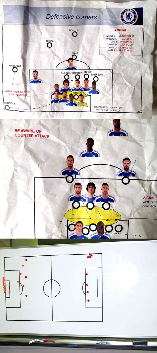 첼시의 각 수비수들 얼굴엔 자신이 마크해야 할 상대의 이름이 쓰여 있으며, 이동 경로까지 자세히 나와있다.