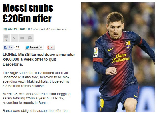 익명의 러시아팀이 '축구의 신' 리오넬 메시(바르셀로나)에 제시한 금액이다. 28일(한국시각) 스페인 일간지 마르카에 따르면 한 러시아구단이 메시의 바이아웃 금액과 엄청난 주급을 제시했지만, 거절당했다고 보도했다. 이 러시아 클럽은 거스 히딩크 감독이 이끌고 있는 안지로 추정되고 있다.
