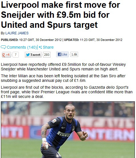 31일(한국시각) 영국 일간지 데일리메일은 리버풀이 스네이더르 영입을 위해 950만파운드를 제시했다고 보도했다. 스네이더르가 받던 연봉보다 160만파운드를 적게 제시한 리버풀은 일단 스네이더르측에 의해 거절당한 것으로 알려졌다. 스네이더르는 주급으로 20만파운드를 받는다. 스네이더르 영입전에는 리버풀 뿐만 아니라 맨유, 토트넘도 포함돼 있다.