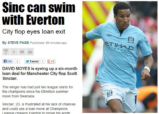 1일(한국시각) 영국 일간지 더선은 에버턴이 싱클레어에게 6개월 임대제의를 할 예정이라고 보도했다. 싱클레어는 2012년 런던올림픽에서 한국과 8강전을 치른 영국 단일팀의 일원이라 한국팬에도 친숙하다. 싱클레어는 올시즌을 앞두고 800만파운드에 스완지시티를 떠나 맨시티 유니폼을 입었다. 그러나 이적 후 두터운 선수층에 막혀 도무지 출전기회를 잡지 못하고 있다. 단 2번 선발출전했을 뿐이다. 불만이 극에 달한 상태다.