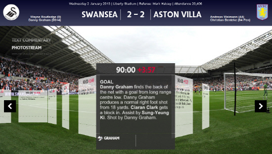 극적인 승부였다. 스완지시티는 라우틀리지의 선제골을 앞세워 1-0 리드를 잡았다. 그러나 3연패에 빠져있던 애스턴빌라의 반격이 매서웠다. 전반 44분 바이만이 동점골을 만들어내더니 후반 39분 벤테케가 페널티킥을 침착하게 성공시키며 2-1로 역전에 성공했다. 동점골은 기성용의 발끝에서 시작됐다. 후반 추가시간, 기성용은 오른 측면에서 올라온 크로스를 컨트롤 한 뒤 뒤에 있던 그래엄에게 패스를 했다. 그래엄은 슈팅으로 연결했다. 첫 번째 슈팅은 수비벽에 막혔다. 그러나 그래엄은 흘러 나온 볼을 놓치지 않았다. 다시 슈팅으로 연결, 골망을 갈랐다.